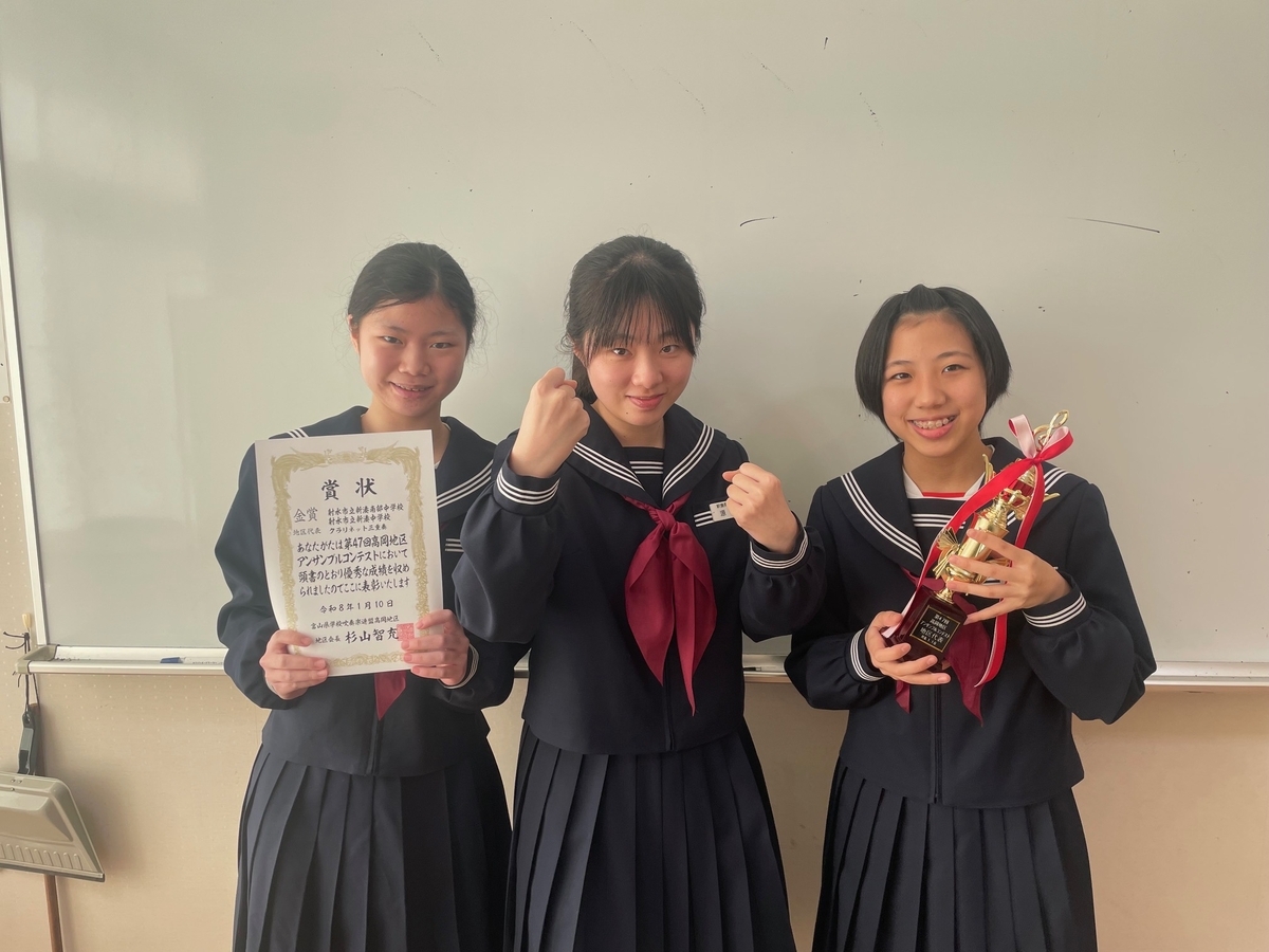 2026-01-13 高岡地区アンサンブルコンテスト結果 🎵 打楽器三重奏 金賞・地区代表 🎵 サクソフォン四重奏 金賞・地区代表 🎵 クラリネット三重奏 金賞・地区代表 🎵 金管五重奏 金賞 日々練習を重ね、少人数編成ならではの音色の調和や表現力を高めてきた成果が、本番の演奏で存分に発揮されました。金賞受賞、そして地区代表に輝いた吹奏楽部の皆さん、おめでとうございます。