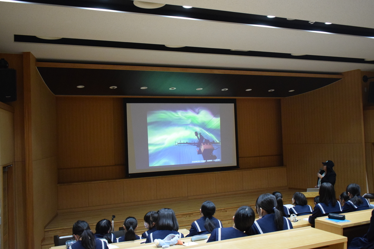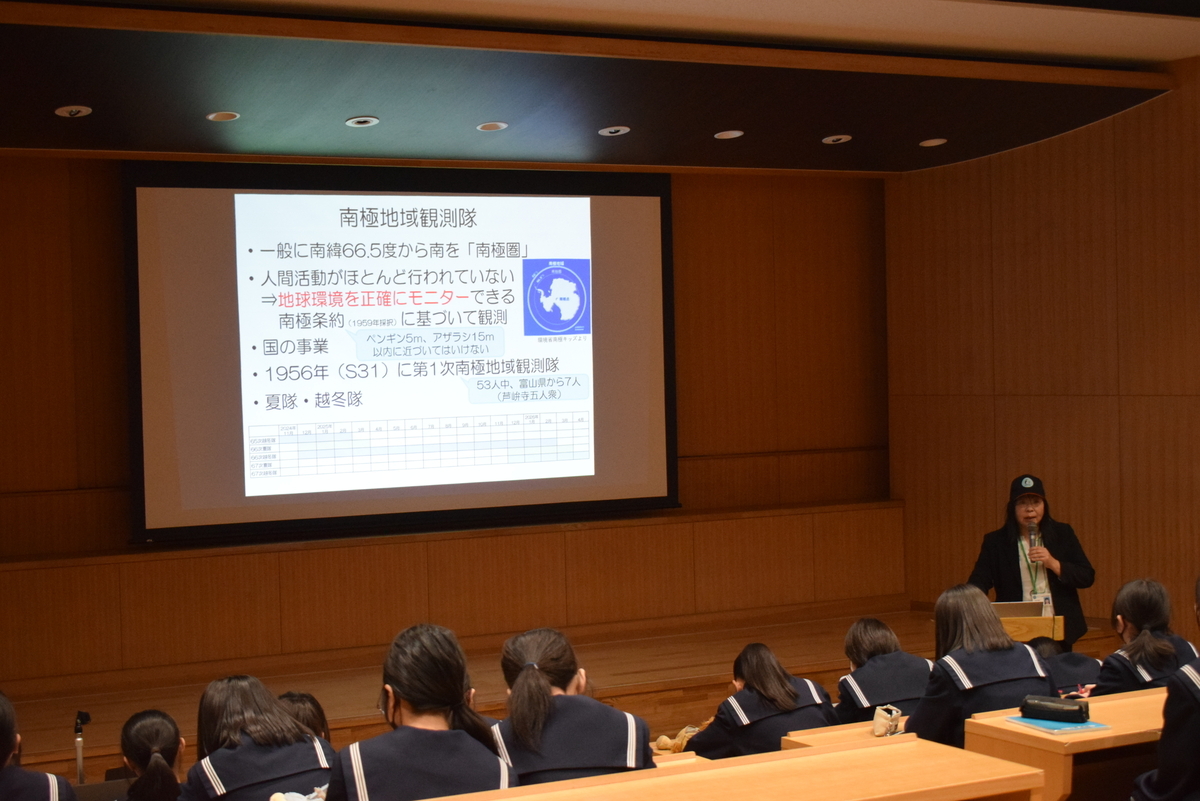 んを講師にお迎えしました。南極での仕事や生活についてクイズを交えて楽しくお話しいただき、未知の世界に生徒たちは興味津々でした。木戸さんからは、「出会いやチャンスを大切に、好きなことを見つけて続けよう」とメッセージをいただきました。